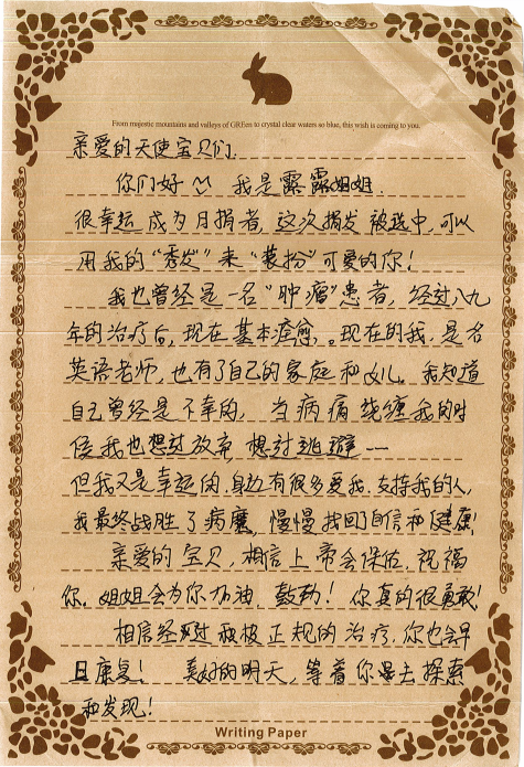 所有癌症儿童得到有效治疗和照顾,拥有生命尊严和身心健康,平等地融入社会。
