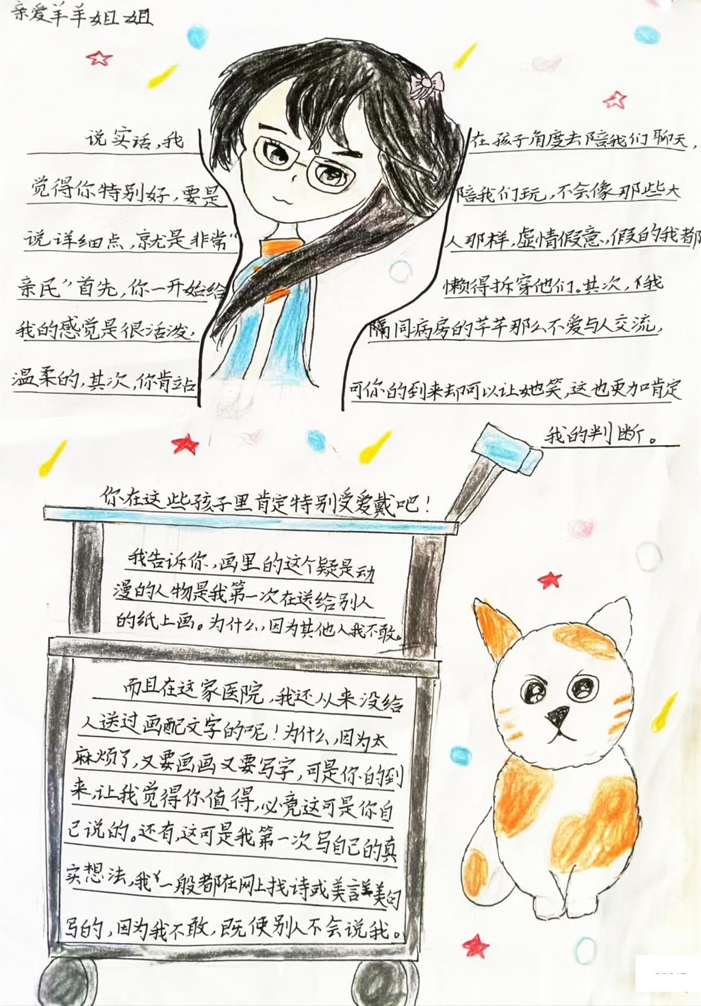 病房娱乐活动 在漫长的治疗之旅中,病房成为了孩子们临时的家。面对单调的住院生活,许多孩子选择用手机或平板电脑来打发时间,寻找片刻的娱乐。 为了促进孩子们身心的全面康复,游戏师精心策划了一系列病房娱乐活动,为他们点亮希望的色彩。游戏师们精心挑选了多样化的手工材料包和玩具,同时设计了一系列富有创意的游戏活动。这些活动旨在鼓励孩子们放下屏幕,投入到互动游戏中,让他们在欢笑与玩耍中放松心情、释放压力,同时锻炼注意力和创造力。 在这里,孩子们可以尽情挑战拼图、搭建积木、挥洒画笔进行绘画创作,或是动手制作精美的手工艺品。这些活动不仅让孩子们的智力得到锻炼,更在无形中提升了他们的社交能力和团队协作精神。 病房内,我们还准备了琳琅满目的玩具和书籍,供孩子们根据个人喜好自由选择。无论是沉浸在书籍的海洋中,还是与心爱的玩具共度时光,孩子们都能在这片小天地里找到属于自己的快乐,让住院生活焕发别样的光彩。 病房娱乐活动在孩子们的康复旅程中扮演着至关重要的角色。通过参与这些活动,孩子们不仅能更快地适应医院环境,减轻内心的焦虑与压力,还能在欢笑与游戏中勇敢地面对治疗和康复的挑战。让我们共同努力,为病房里的孩子们营造一个充满欢乐与温暖的康复乐园,让爱与希望伴随他们每一步的成长。 |