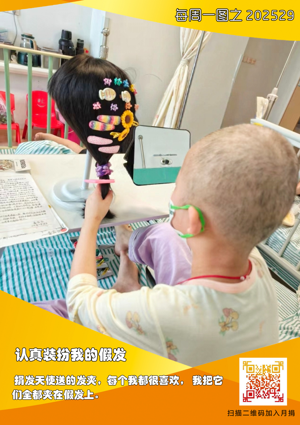 本项目通过接收社会捐发、募集资金,联合公益伙伴及医院社会工作部门,为符合条件的申请者免费定制和赠送假发。累计到2025年8月底,已经有来自全国各地129家医院的5423位小朋友戴上舒适而美观的真人发套。 关于广州金丝带和为爱发生项目的问题,大家可以点击查看:为爱发生:用头发传递爱与希望 |