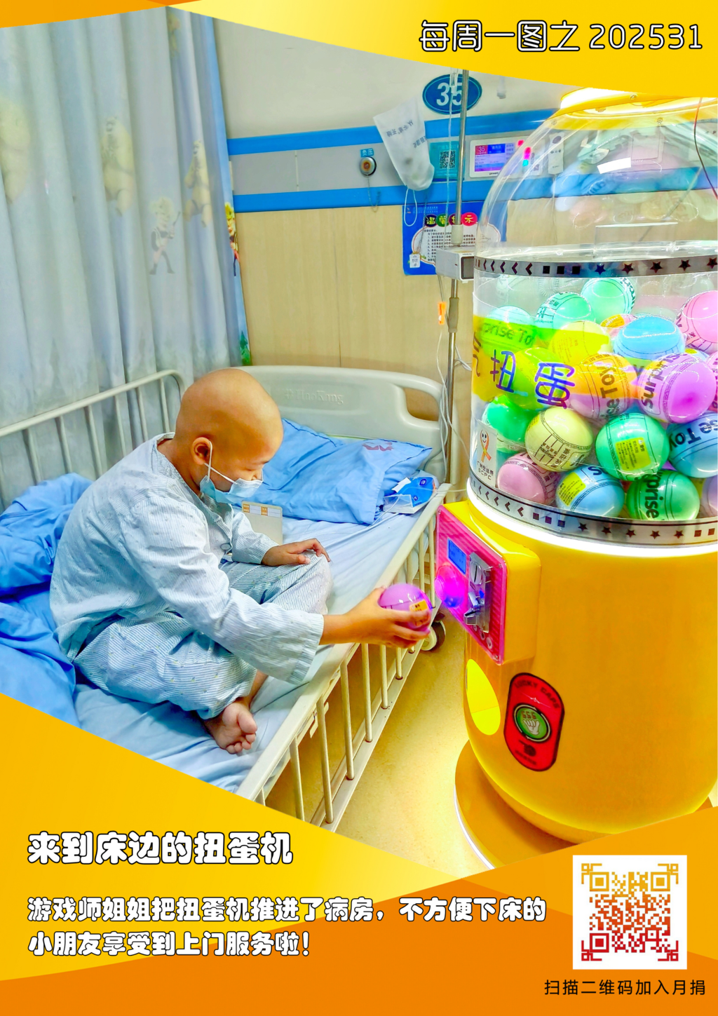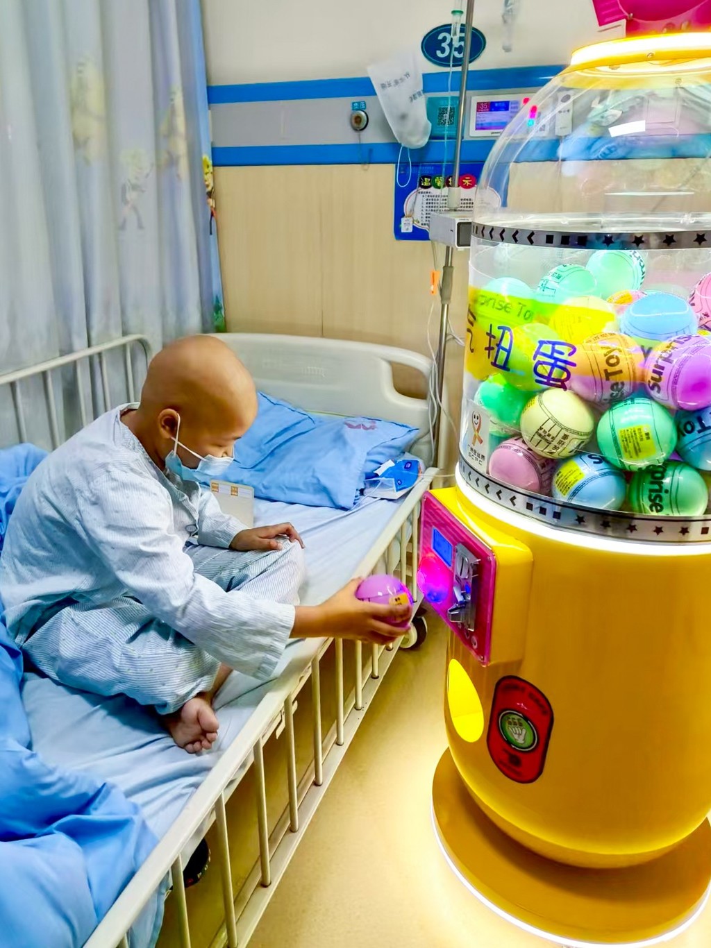 吉大一院勇气扭蛋反馈 广州金丝带送给香柏树孩子们的“勇气扭蛋机”已经在吉大一院落户一周了。为了获得扭蛋币,小患者们每天积极打卡:读书、运动、好好吃饭,治疗时也展现出超乎想象的勇敢——扎针时不哭闹,做骨穿时咬牙坚持,一个个瞬间令人动容。 这份温暖的公益礼物,让小勇士们的每一步努力都被看见、被奖励。未来,爱与陪伴将继续在这里生根发芽,为孩子们的治疗之路添一抹亮色。 |