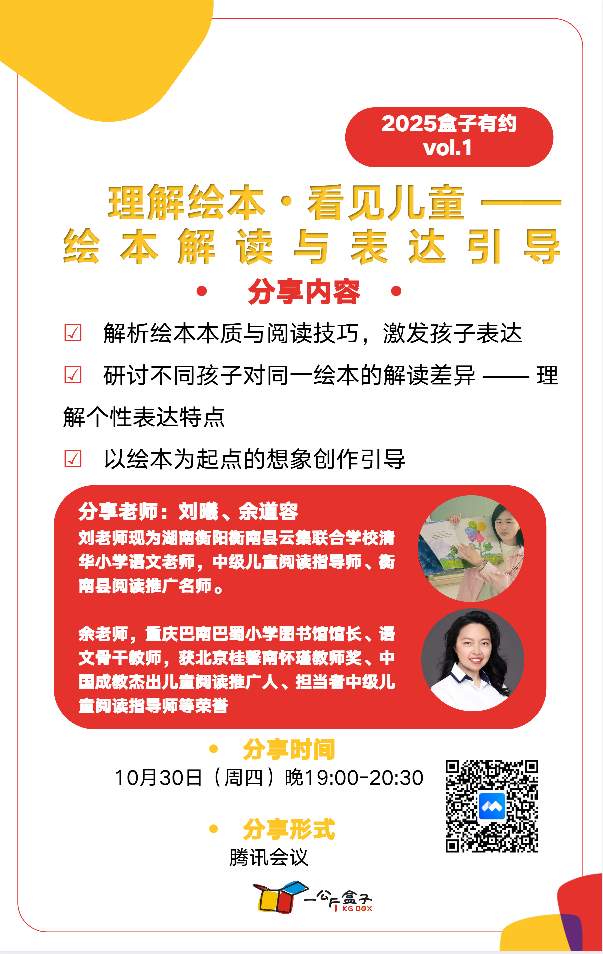 10月30日,邀请刘曦、余道容两位有经验的老师开展线上分享:刘曦老师围绕绘本中的美育课,看见孩子们的创作小故事和情感,余道容老师分享七步读懂绘本、如何选择合适的绘本,从各个角度详细解读绘本。1小时交流中,老师们纷纷留言“一下子打开了新方向”“收获满满”,这份跨屏温暖,正是您的支持所传递的力量。