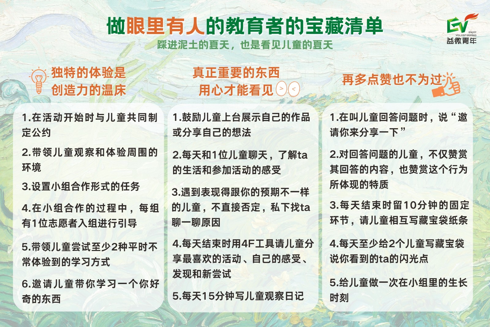 今年的创新教育体验营中还嵌入了“做眼里有人的教育者宝藏行为清单”,希望志愿者们在“玩耍”中保持对“眼里有人”的觉察,为7-8月开展的乡村夏令营做好准备。