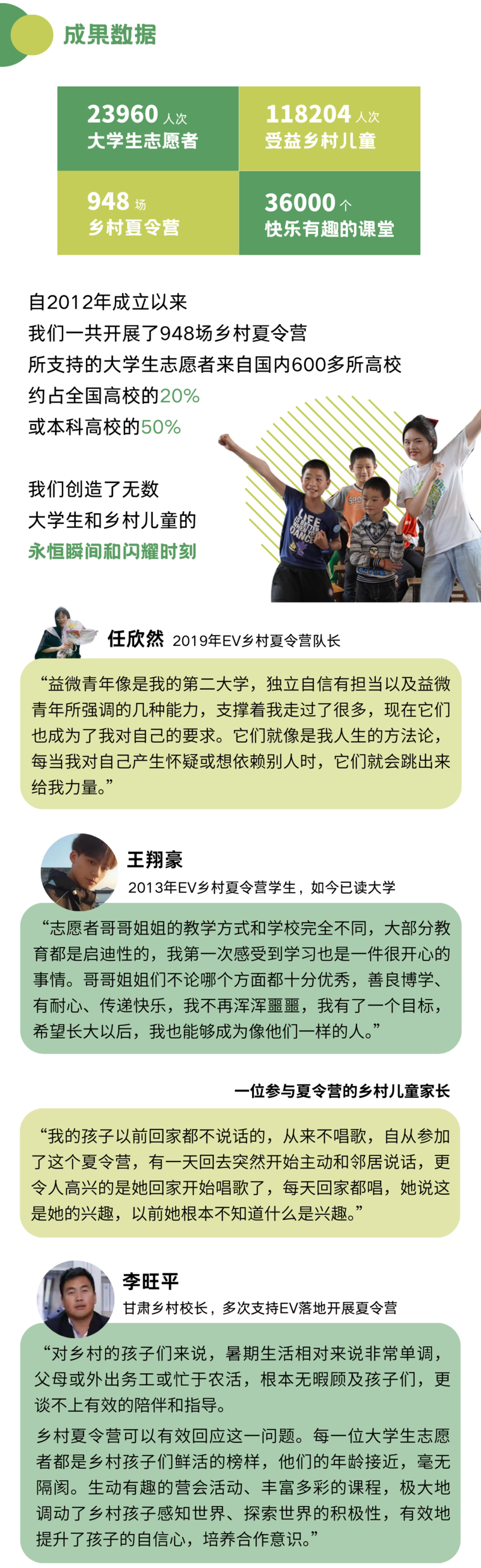 每年,益微青年都会支持上千位大学生奔赴乡村,为缺乏素质教育资源的儿童带去好玩有趣的夏令营,支持大学生志愿者在公益行动中提升同理心、独立思考和协作共创能力(统称“EV力”),成长为独立自信有担当的青年。