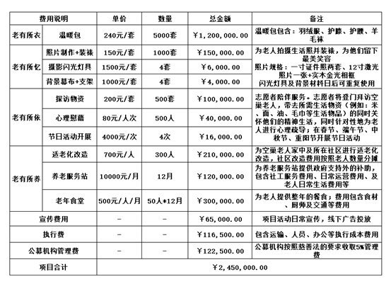 2.老有所依:志愿陪伴计划,为空巢老人提供日常陪伴,并辅以发放生活礼包(单价200元)、贴春联送年货等活动,老人食堂