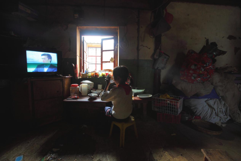 (独自一人在家,独自吃饭睡觉上学的困境儿童)