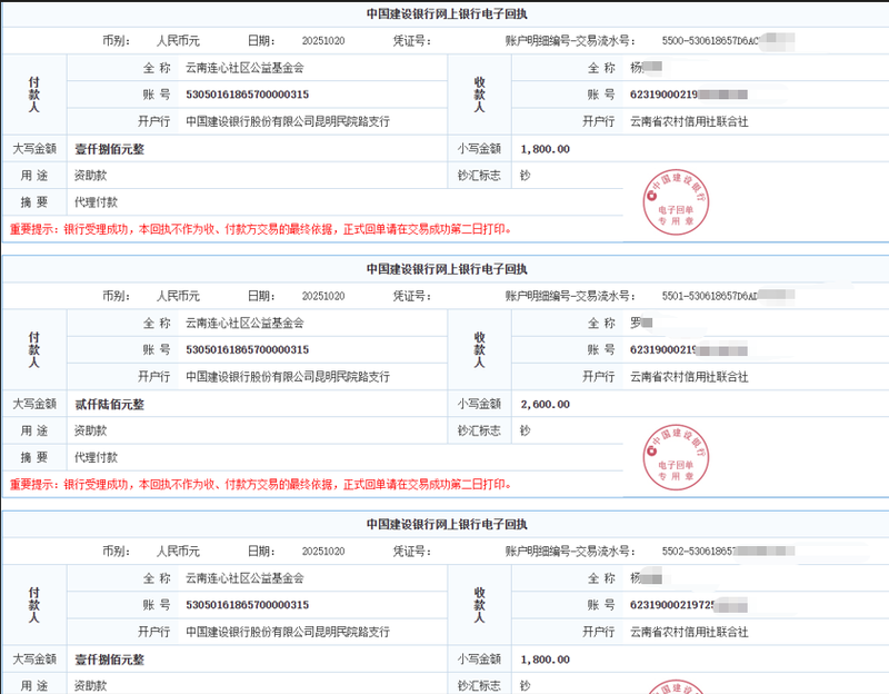 2025年10月20日,云南连心社区公益基金会工作人员再确认和更新受助学子信息后,统一给学子们汇款助学善款。