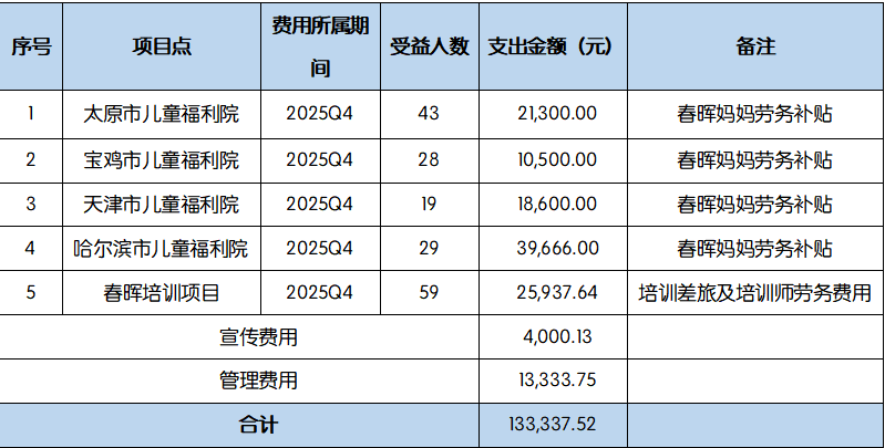 2025年10月1日至12月30日,本项目共收到善款185,253.87元,累计支出善款133,337.52元,支持太原市儿童福利院、宝鸡市儿童福利院、哈尔滨市儿童福利院、天津市儿童福利院开展春晖妈妈项目,累计受益儿童119人。组织开展4次项目培训/跟进,帮助59位春晖妈妈们更好地掌握儿童抚育技巧,为孩子们提供更专业的照料。