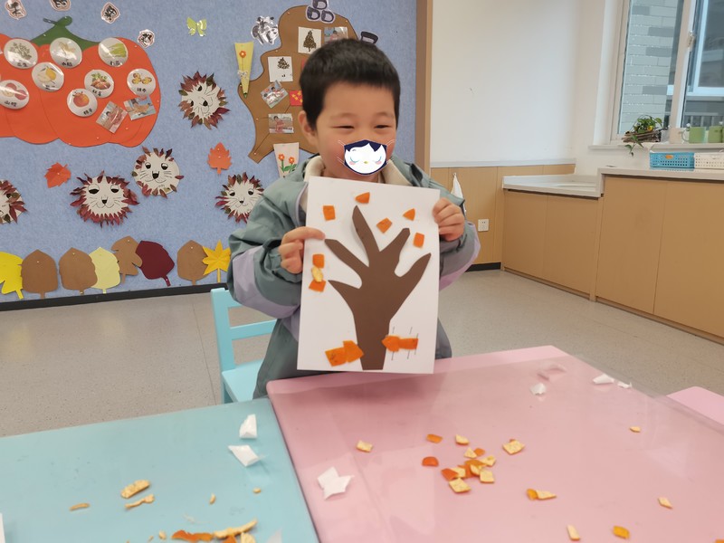 在接下来时间里小华的变化有目共睹。曾经那个胆小怯懦、不愿主动交流小华,在春晖老师的耐心引导下,慢慢变得勇敢自信,愿意尝试新事物,敢于表达自己的想法。手工课上,大家用橘子皮做手工,小华很有想法的告诉春晖老师“我想做一颗橘子树”,得到认可后,小华投入其中,只见他捏着轻薄的橘子皮,细心地撕成各种形状,然后拼接、粘贴。当“橘子大树”做好后,小华捧着自己的作品,露出了自信的笑容。