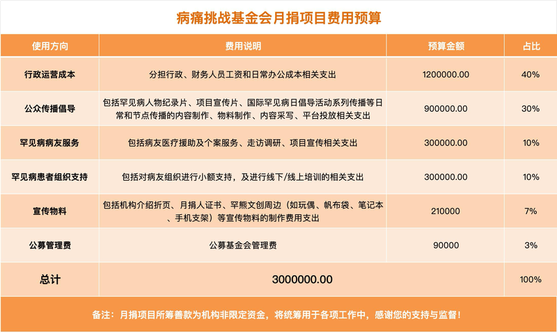 您的善款将用于整体支持病痛挑战基金会的罕见病相关工作,本募款周期内筹款目标为3,000,000.00元,将按下表的比例及内容使用: