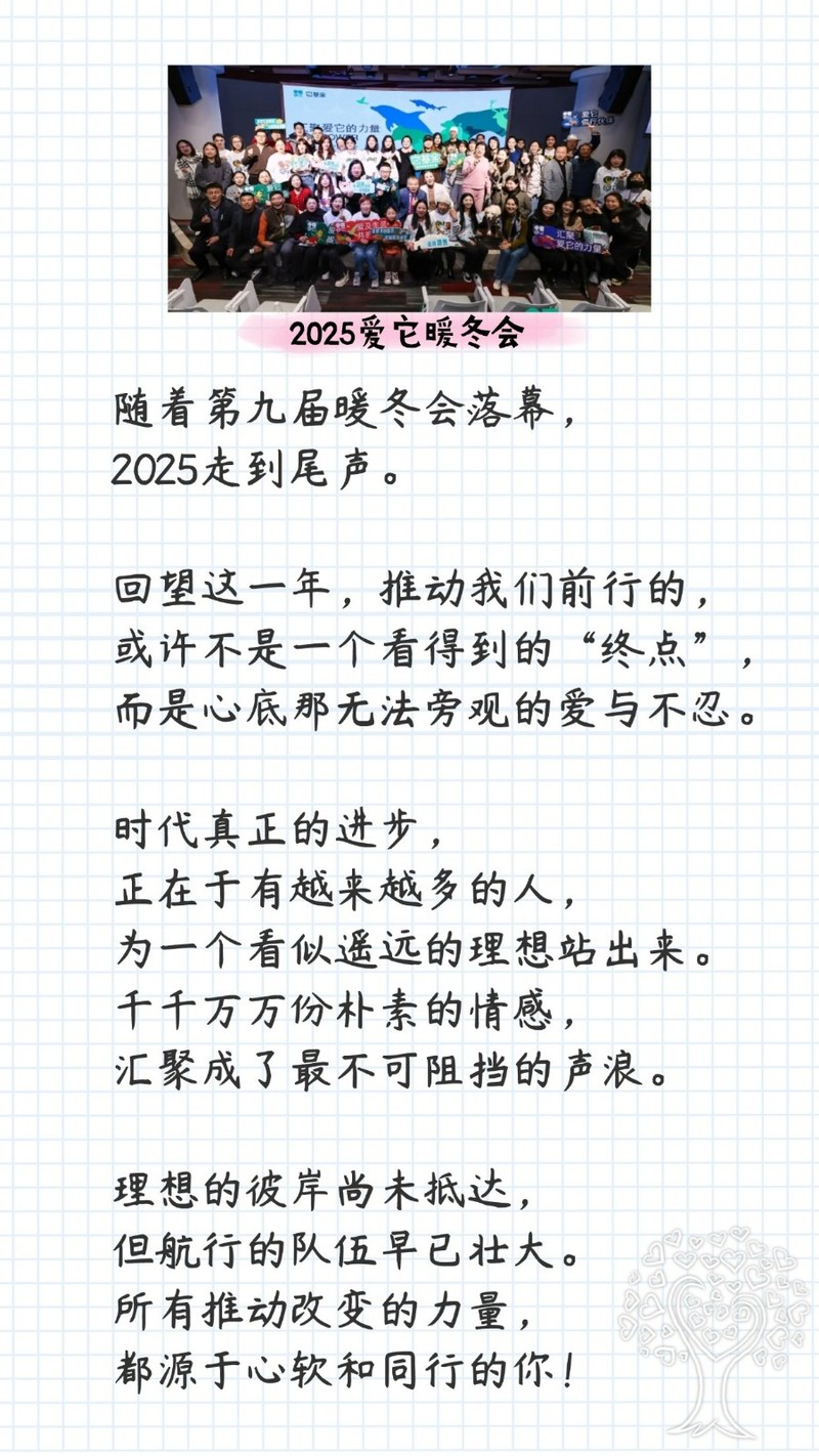 2025年全年,开展4期“爱它观影团”公益专场;制作8期《我和我的动物朋友》系列节目(以“每一个生命都是一个动人的世界”为核心理念,通过嘉宾分享展现动物与人类的多元联结);随着第九届“爱它暖冬会”落幕,2025年的公益脚步也暂告一段落。回望这一年,推动我们前行的,或许不是一个看得到的“终点”,而是心底那无法旁观的爱与不忍。