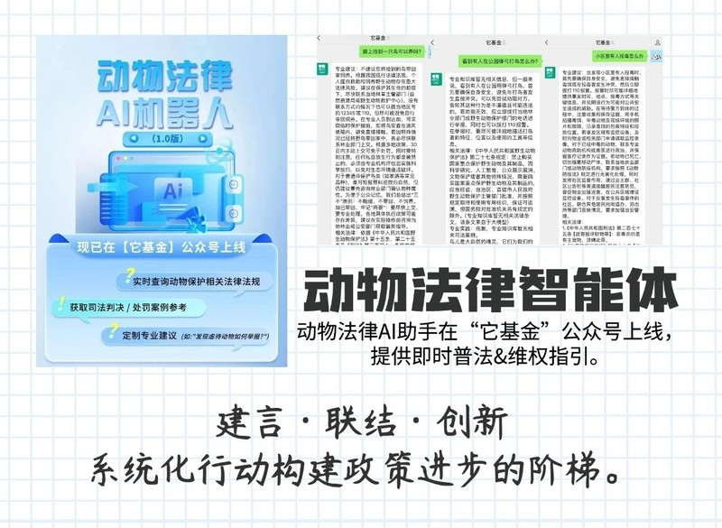 2025年全年,上线动物法律AI机器人(1.0版),完成动物保护立法项目建议提交,并向2500位各级人大代表开展政策倡导、与近50位代表建联,以“工具赋能+制度推动”的立体模式,为动物保护筑牢长效基础。