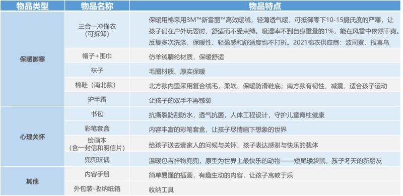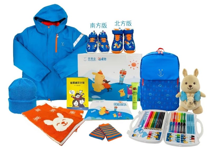 每年10月至次年2月,壹基金温暖包为孩子配置保暖御寒物品,包含三合一冲锋衣、针织帽、围巾、袜子、鞋子、护手霜、书包、彩笔套盒、绘画本、兜兜玩偶、家庭安全计划手册、收纳纸箱陪伴孩子们温暖过冬。壹基金温暖包的儿童友好设计,细心满足孩子的多样需求。