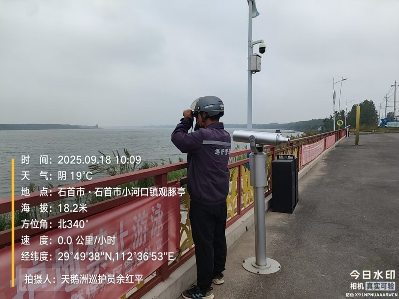 9月,湖北长江天鹅洲和新螺段白鱀豚国家级自然保护区的社区巡护队在高温下继续坚守岗位,开展了全面的水陆巡护工作。天鹅洲巡护队9人覆盖21公里的天鹅洲故道和长江干流区域,水上组完成冲锋舟巡护15次,支持水质监测2次、鸟类调查1次,并收缴丝网10条、甲鱼钩20个、炸弹钩4个等非法渔具。陆地岸巡组共3组,累计巡护11,452.1公里、179人次,收缴违法渔具83件,查获非法捕捞案件3起并移交立案,完成水域垃圾清理、水面治理等多项任务,推动了江豚保护与生态恢复。 观测江面情况 ©湖北长江天鹅洲白鱀豚国家级自然保护区
