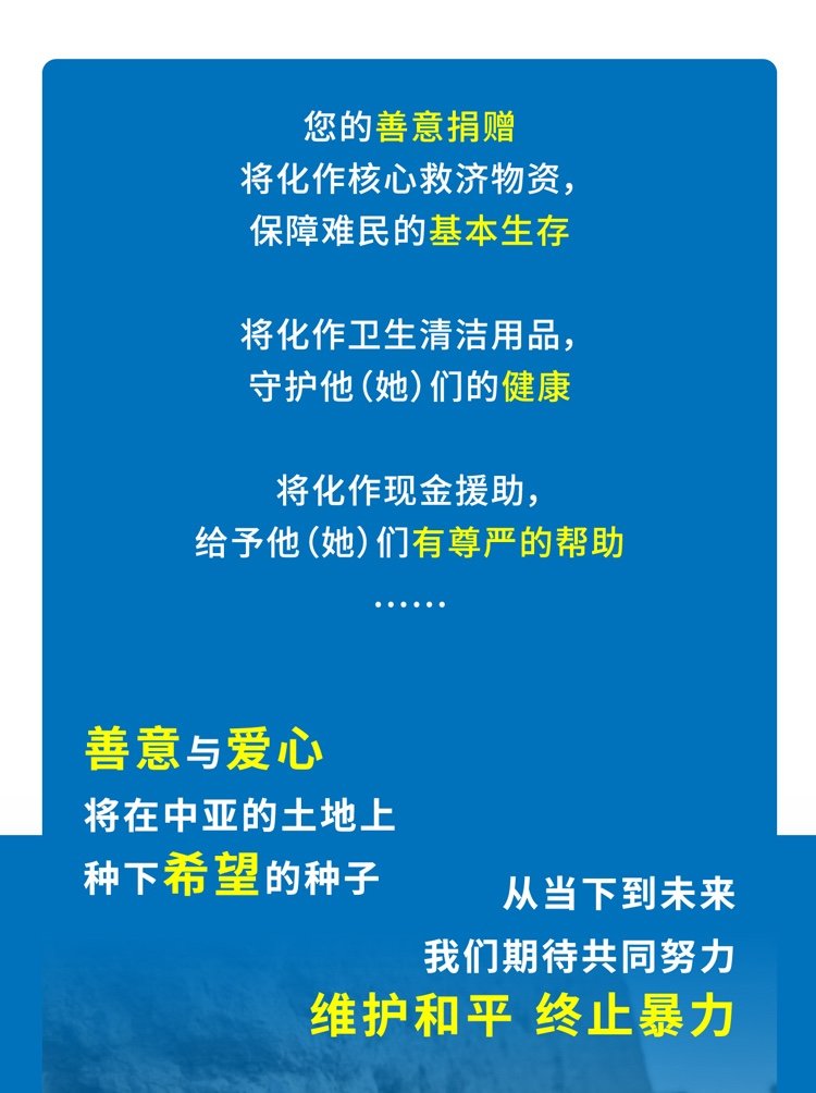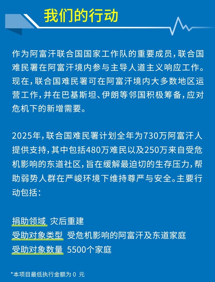 由联合国难民署发起的“阿富汗危机响应行动”项目已于2025年9月20日再次完成在慈善中国的备案,正式恢复线上公益项目的开展。这不仅代表着希望的接力得以延续,也体现了中国公益力量在国际人道主义行动中的持续壮大与担当。感谢您一路以来的等待和信任!您的支持,将再次汇聚成无数阿富汗家庭跨越困境、重拾希望的力量。在全球守望的共同努力下,希望得以穿越山海,传递至那些仍在困境中的家庭。