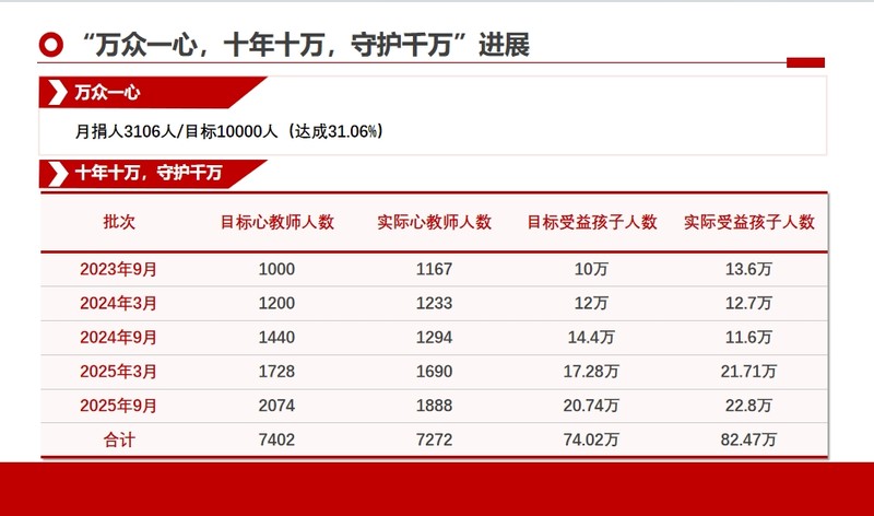 这些数字的背后,有心教师们用心培养好下一代的初心,也来自于每一位捐赠人持续的善意托举,这份双向奔赴的温暖,让我们能向着 “十万心教师,千万孩子受益” 的目标稳步前行。
