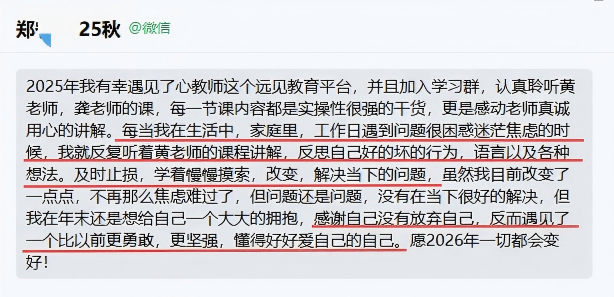 “每当我在生活中,家庭里,工作日遇到问题很困惑迷茫焦虑的时候,我就反复听着黄老师的课程讲解,反思自己好的坏的行为,语言以及各种想法。及时止损,学着慢慢摸索,改变,解决当下的问题”