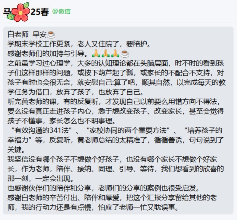 (1)掌握了“341肯定法”等沟通工具,践行“先处理情绪,再处理事情”的原则,实现更有效的师生、家校对话;