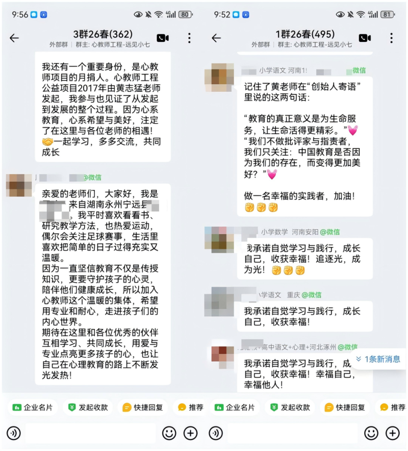 在专属学习社群,心教师们互相分享教学经历与实践经验,共同打造学习、交流氛围,期待心教师们在此次学习之旅,一步步向“幸福的老师”迈进。