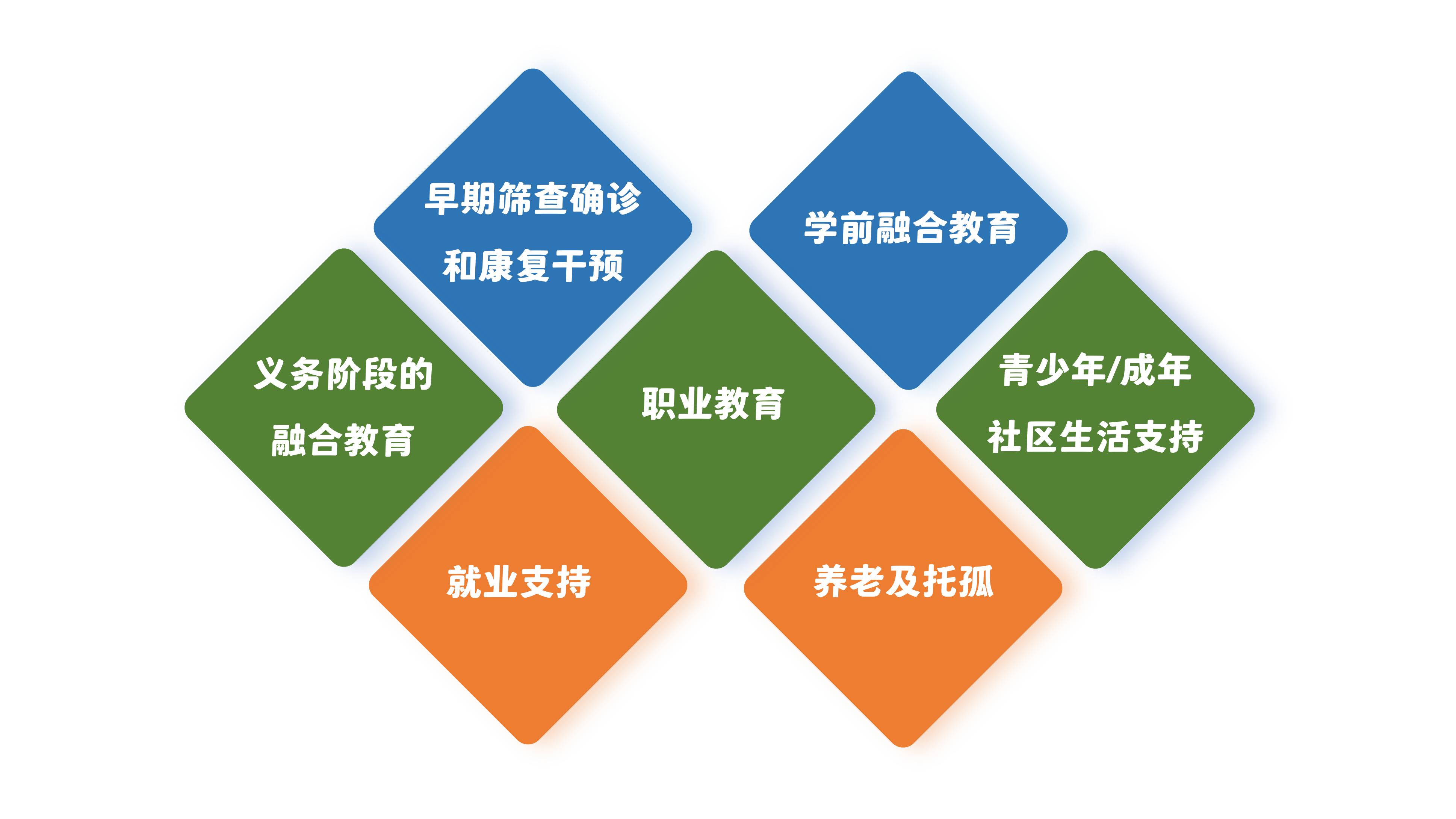 现在,海洋天堂计划即将走入第13年,孤独症家庭全生涯面临的挑战仍然艰巨,很多空白点待填补——孤独症谱系障碍人群全⽣涯的服务需求⼤概可以分为七⼤类:
