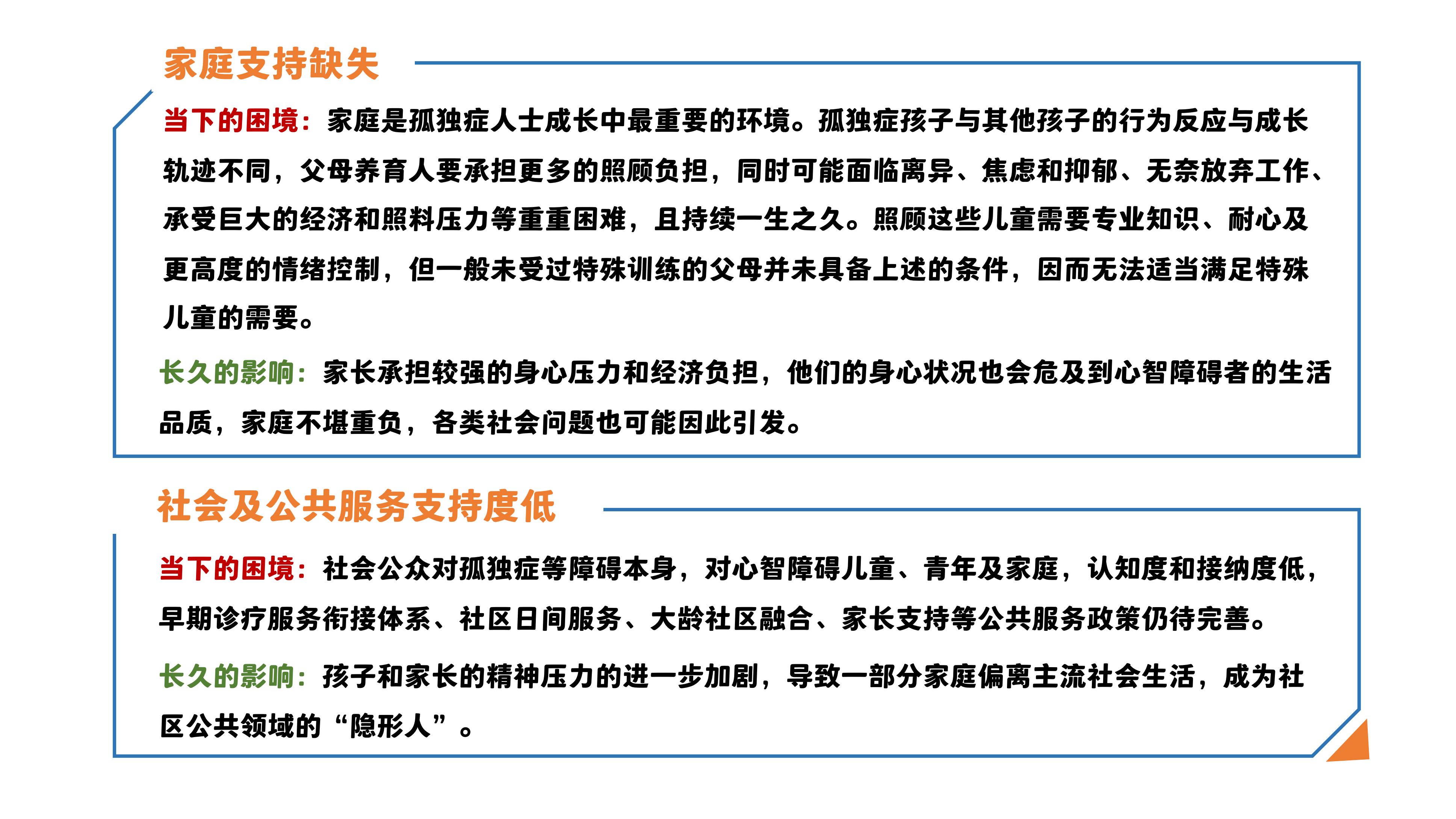 对于每个特殊家庭⽽⾔,要⾯对的问题都是全新的,在每个阶段,孤独症谱系障碍人群和他们的家人都⾯临不同困境。然而,困境需求大,而能提供服务、指引的专业力量不足。孤独症家庭的处处碰壁,处处需要填补的服务空白,反映出国家和社会现阶段对边缘群体提供保障和支持的薄弱环节。但是针对需求发声和推动政策完善和落实的受益者不仅仅是他们,而是这个社会的每个人,每个家庭,每个可能在未来因为某些意外而需要制度保障的个体。我们能够面向这些未知而坦然,必定得益于现在这个群体的努力以及为这个议题提供支持的人们。正因此,海洋天堂计划努力让更多人参与到这个议题中。