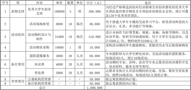 3. 大学生创新创业区域交流活动(9-12月):入围的优秀项目进行集中路演答辩,评选优秀项目并提供创业资金支持;鼓励表现优异的学生加入志愿者队伍,实现公益精神的传承与发展。